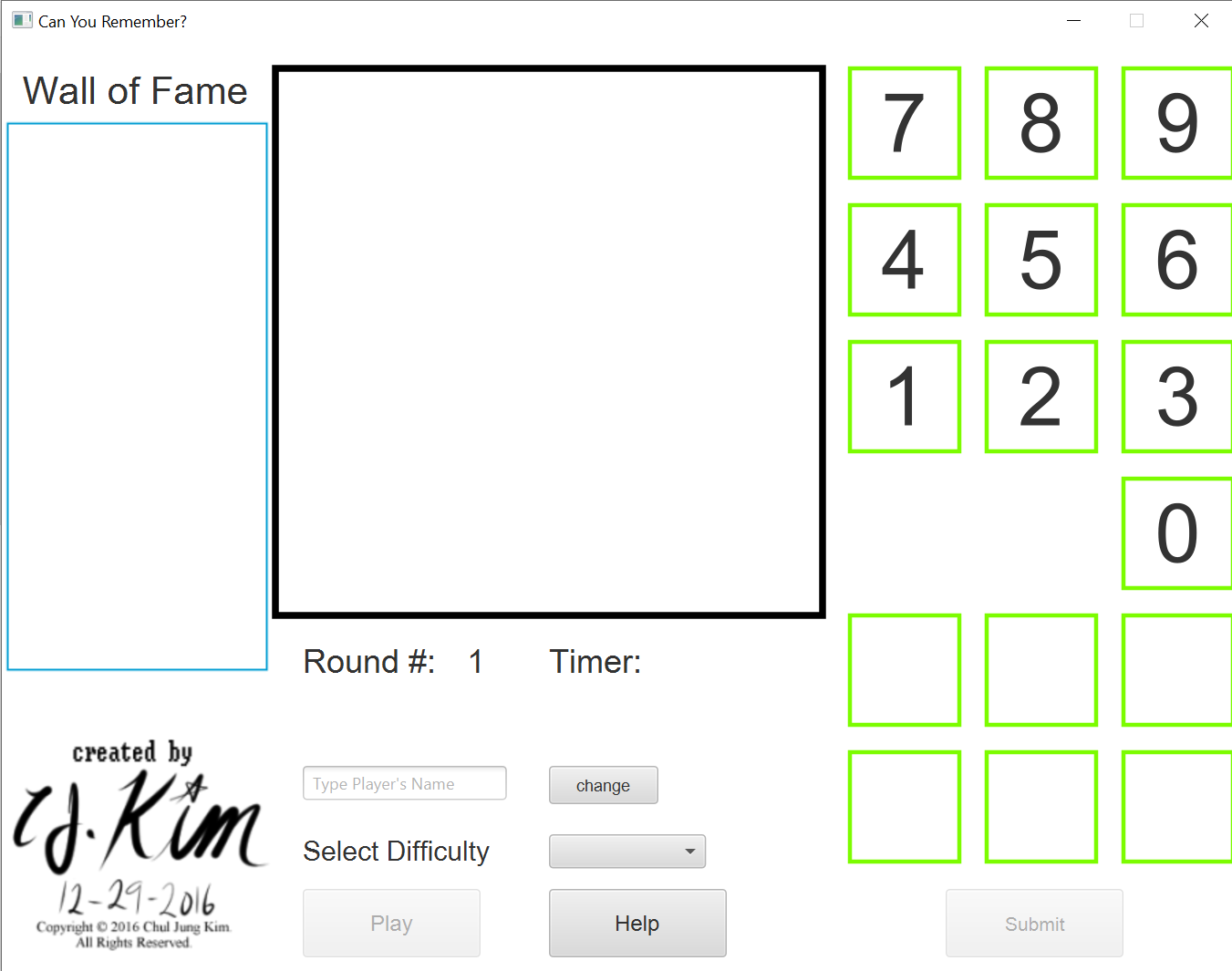 To change difficulty and/or stop playing current mode, you have to retype your name to activate "Play" button. When the game ends, "Play" button activates as well.