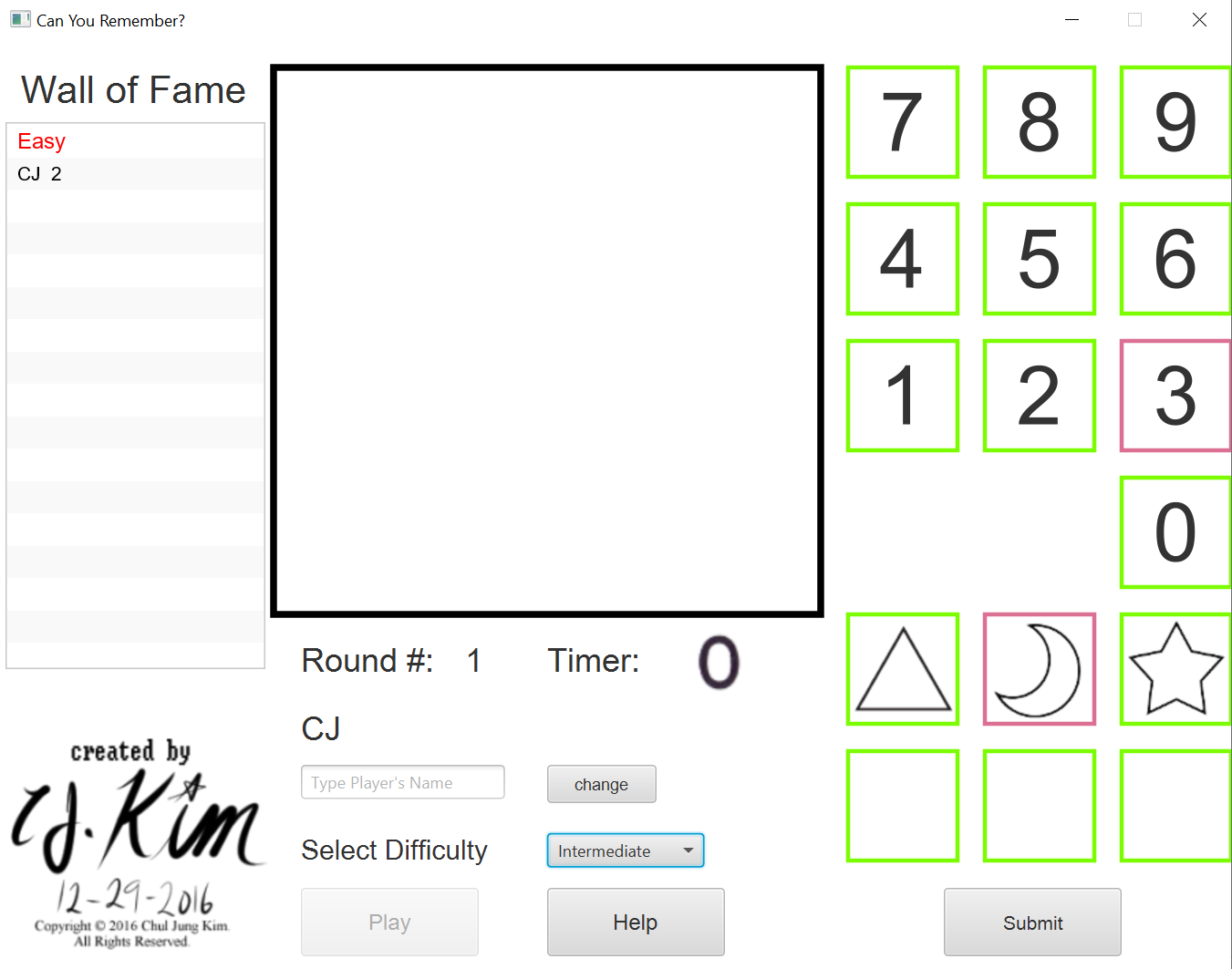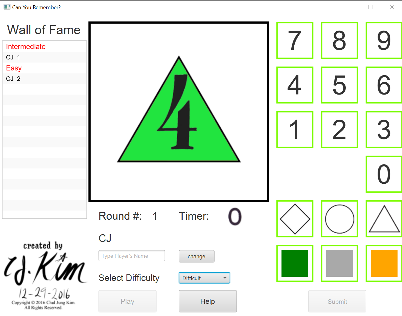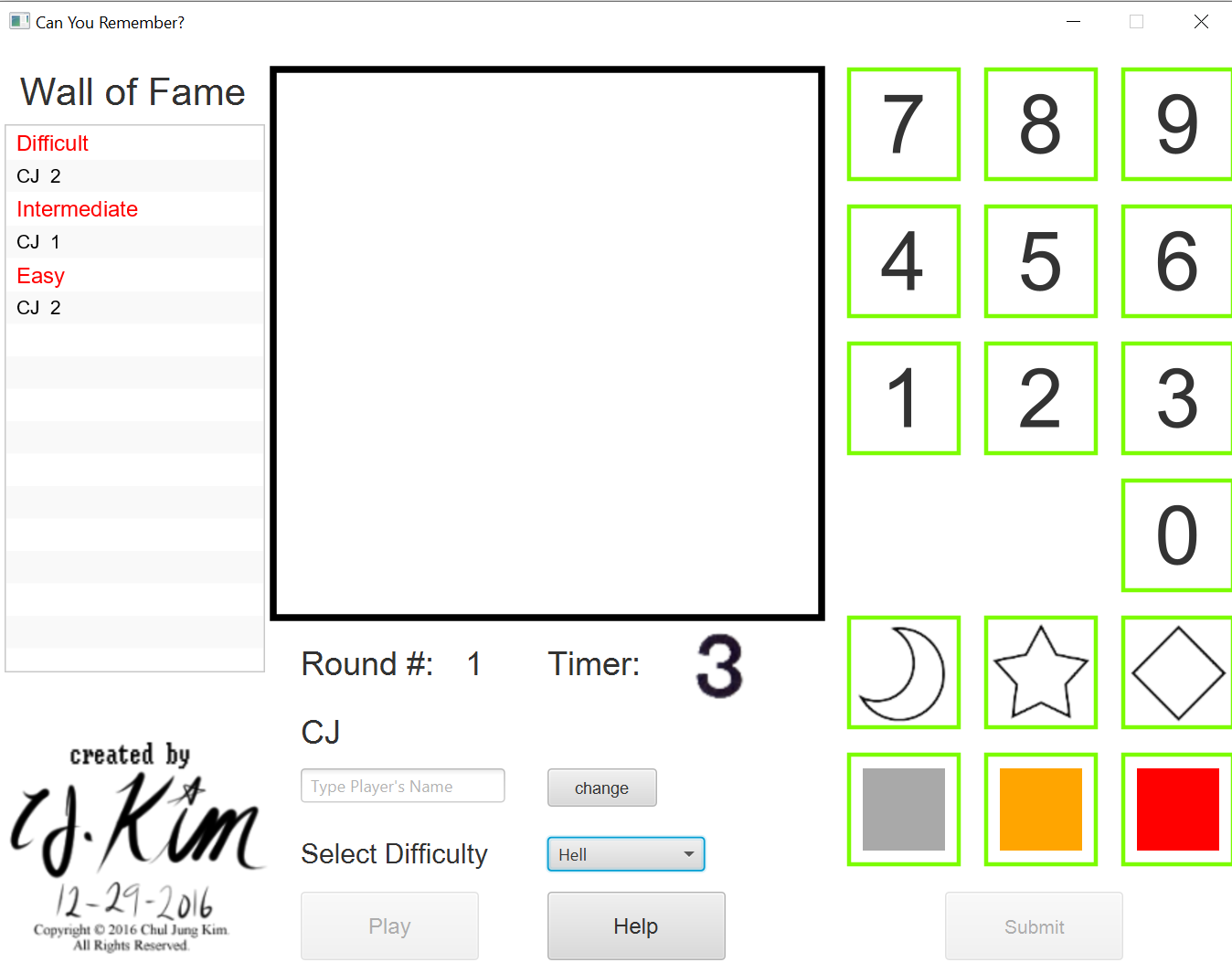 - Same as Difficult mode, except it will only show you the shapes and colors palette for 5 seconds, then it will be hidden.